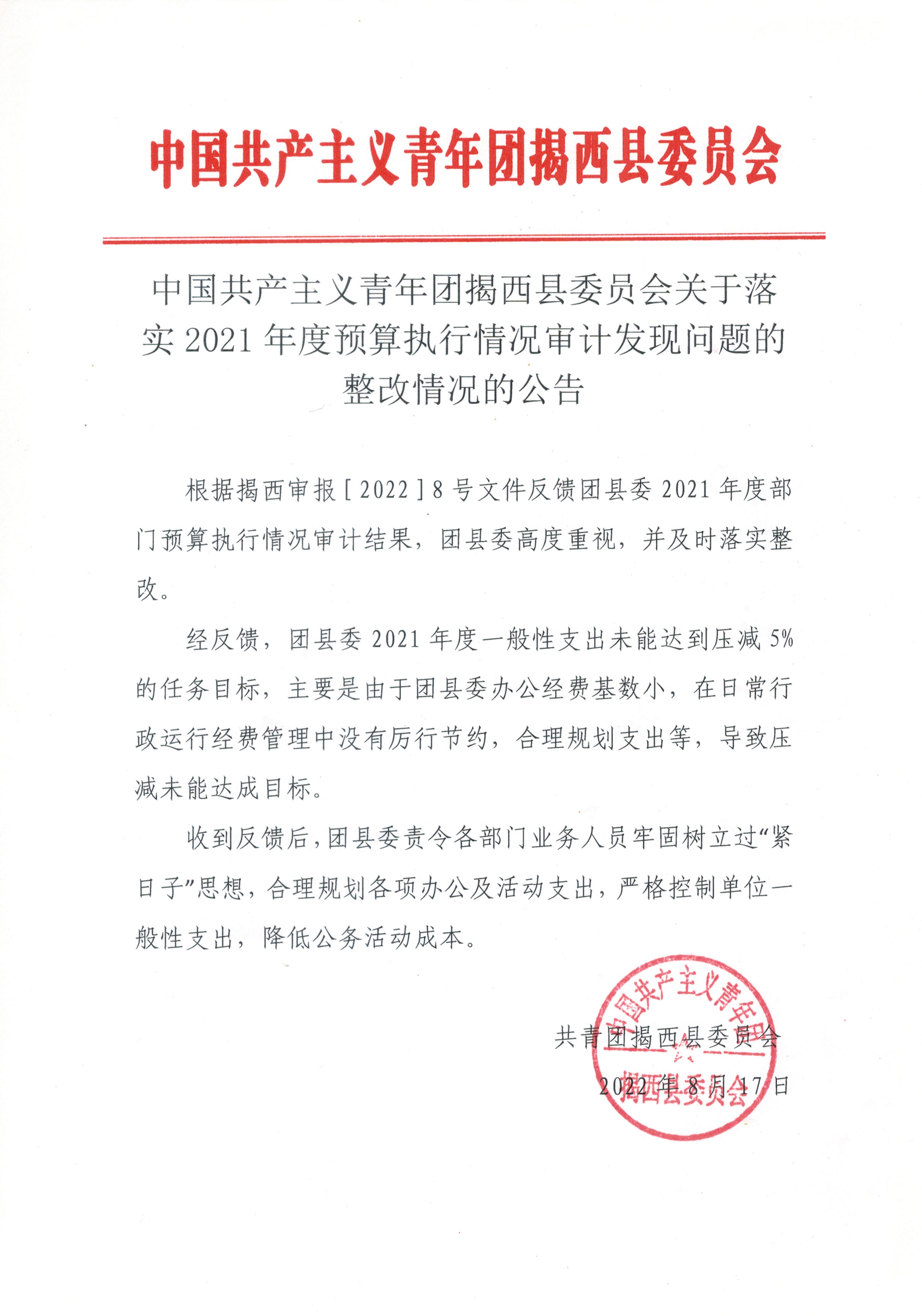 團縣委關于落實2021年度預算執行情況審計發現問題的整改情況的公告